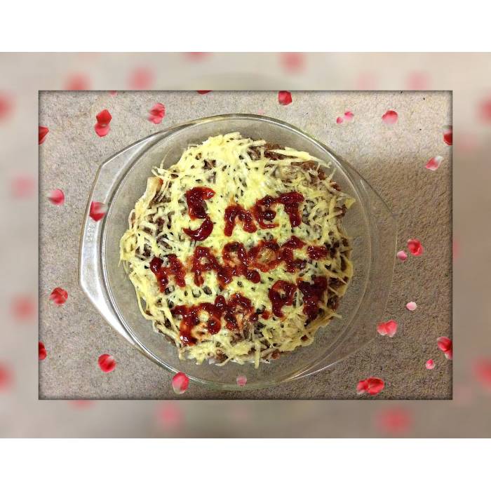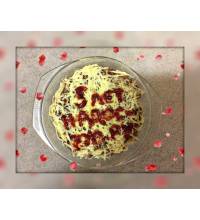 Надпись можно сделать, например, кетчупом, майонезом, выложить зернами кукурузы или любыми другими съедобными способами.